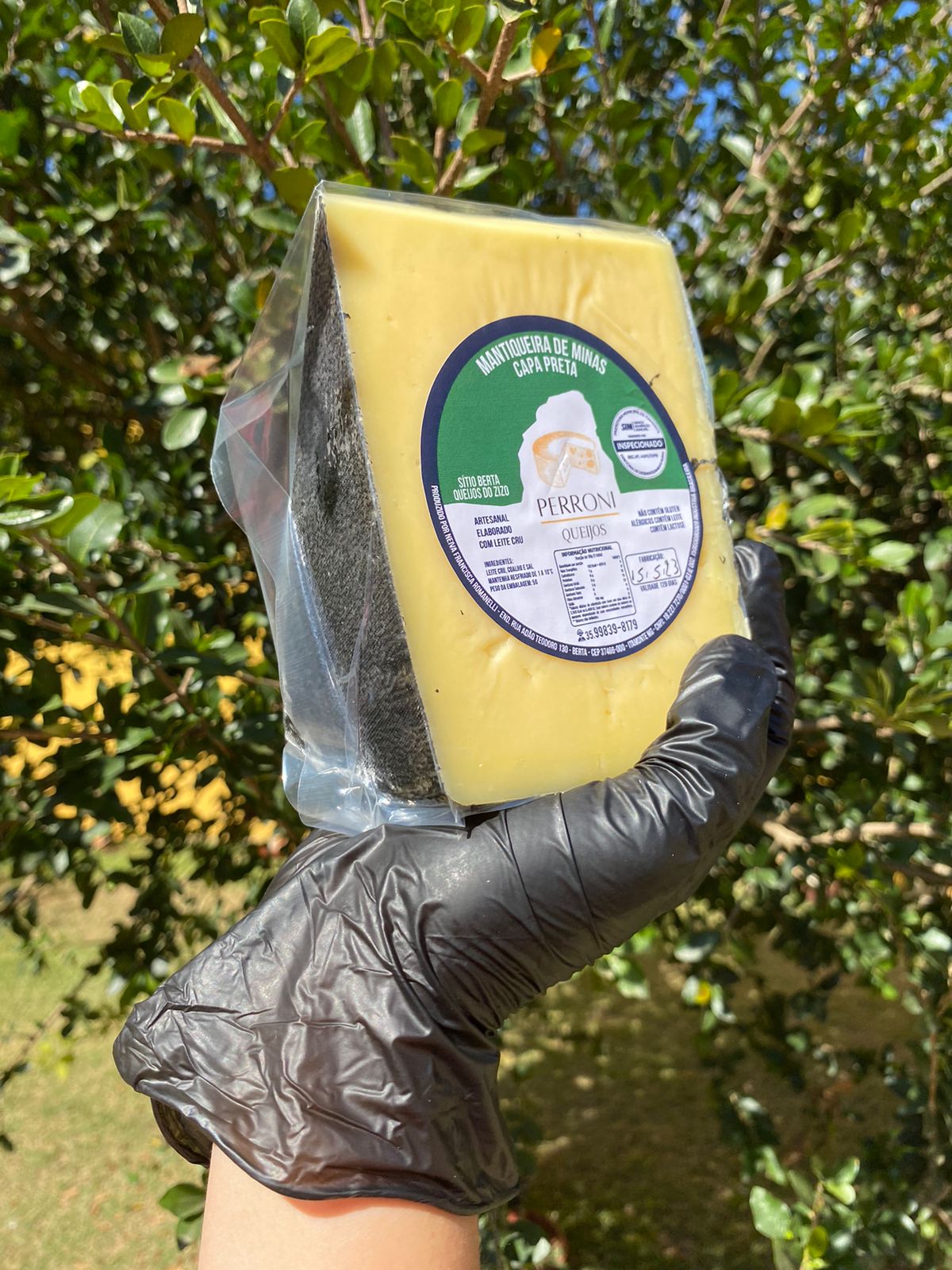 A capa preta é Alga marinha Líquida, que veda o queijo e proporciona uma maturação especial e mais cremosa.
