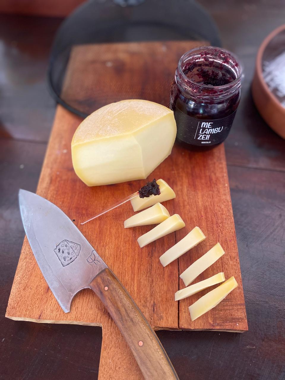 Nosso meia cura especial maturado por 15 dias, suave e cremoso, + Geléria me Lambuzei com pedaços de frutas.